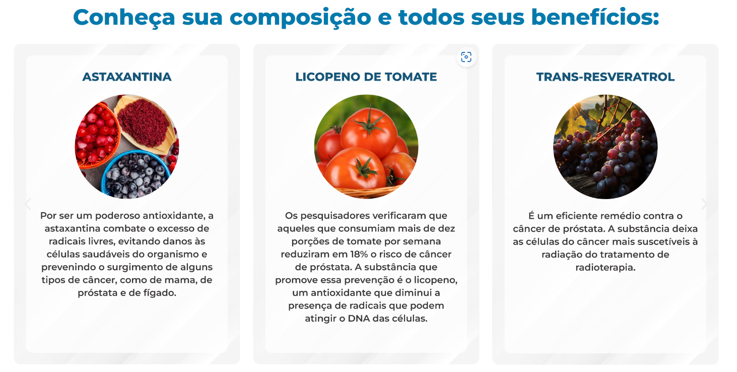 o LIFE PROST consegue potencializar a força natural do sistema imunológico. Toda essa questão pode ser vista por seus mais completos ingredientes: Astaxantina, Licopeno de Tomate, Extrato de Cúrcuma, Extrato de Resveratrol + Vitaminas Essenciais.
