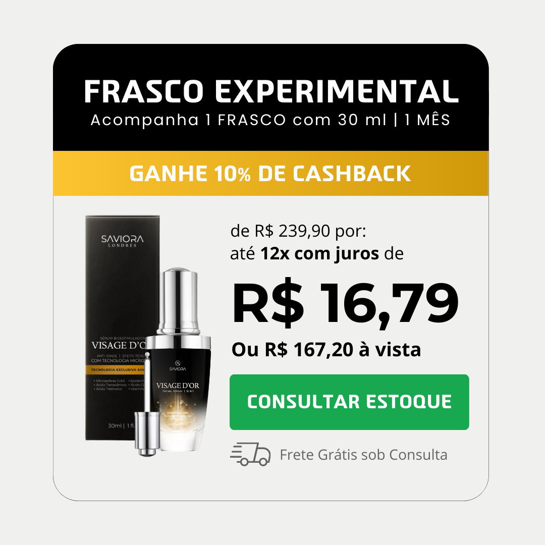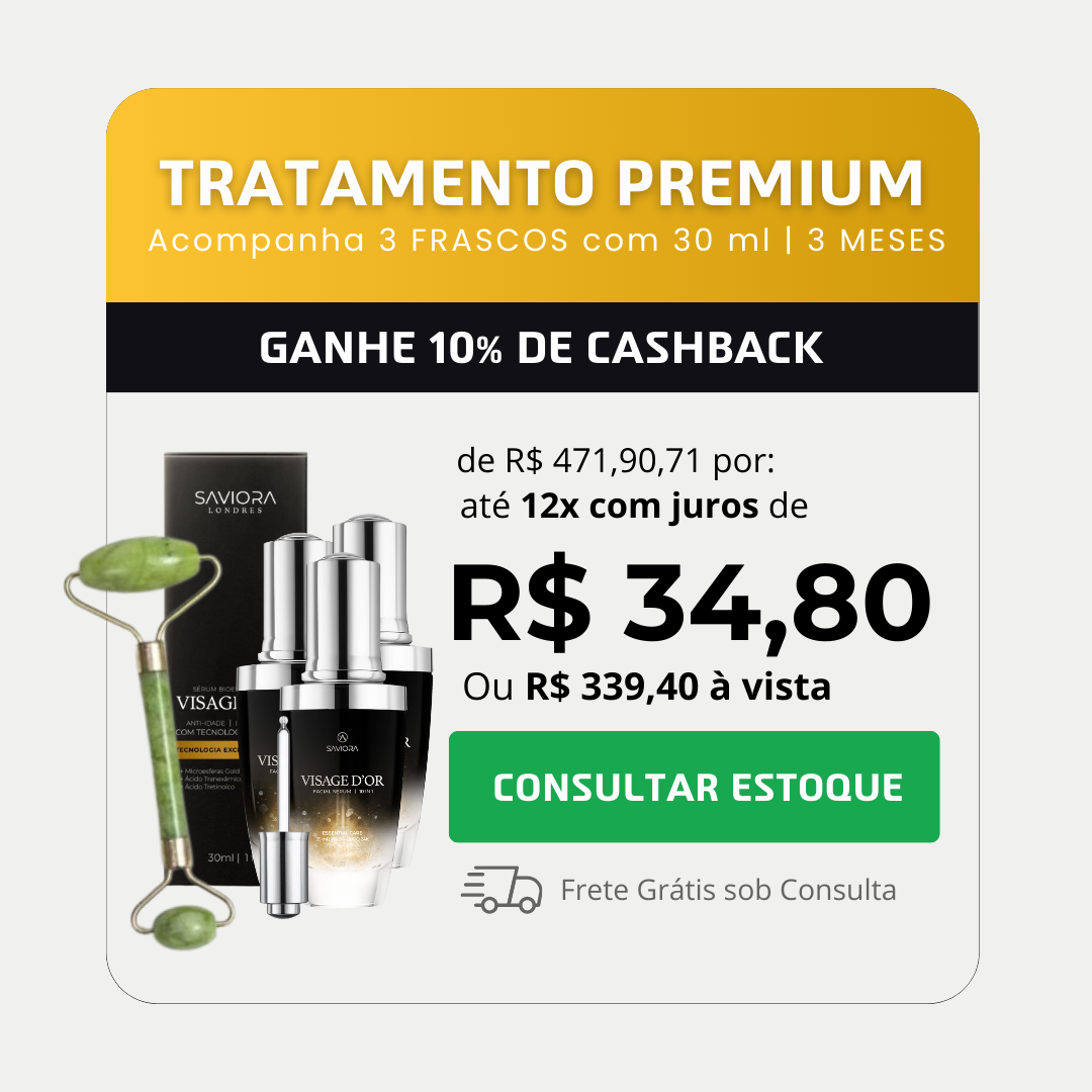 O Visage D’or é um potente sérum facial bioestimulador de colágeno e elastina com partículas de ouro e ingredientes importados regulamentados pelo FDA e pela ANVISA que promete deixar a aparência do rosto mais jovial com um efeito lifting imediato e uma estrutura celular regenerada em poucos dias